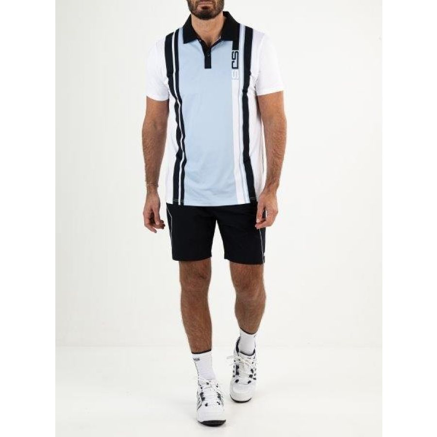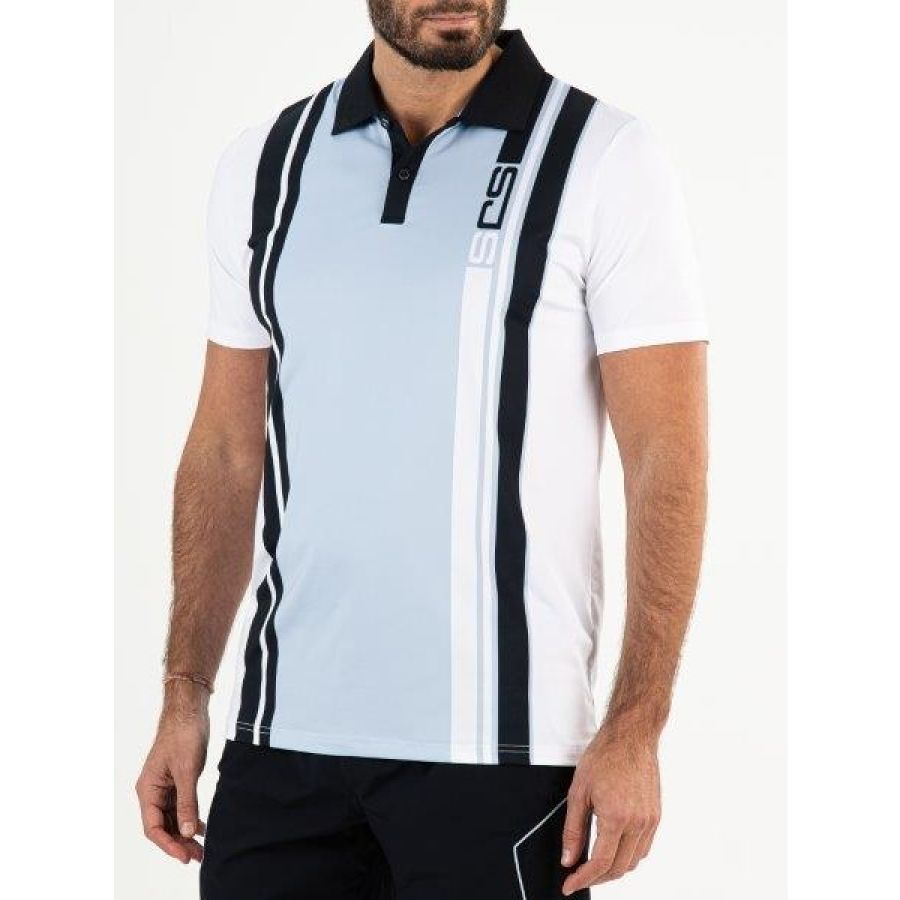 Trendy heren polo van single jersey in powder blue met wit en donkerblauw. Dankzij de verticale banen met een print met het Sjeng Sports logo is deze polo een perfecte mix van sportiviteit en stijl.