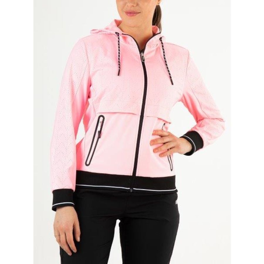 Dit hooded dames jack in de zomerse kleur sorbet pink is ontworpen met veel oog voor detail. Het geweven stretch materiaal van dit jack heeft deels een geperforeerd patroon met daaronder een tweede laag stof. Dit loose fit jack is ideaal voor zowel sportieve als casual outfits.